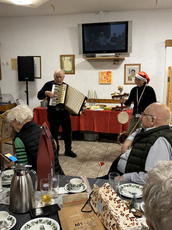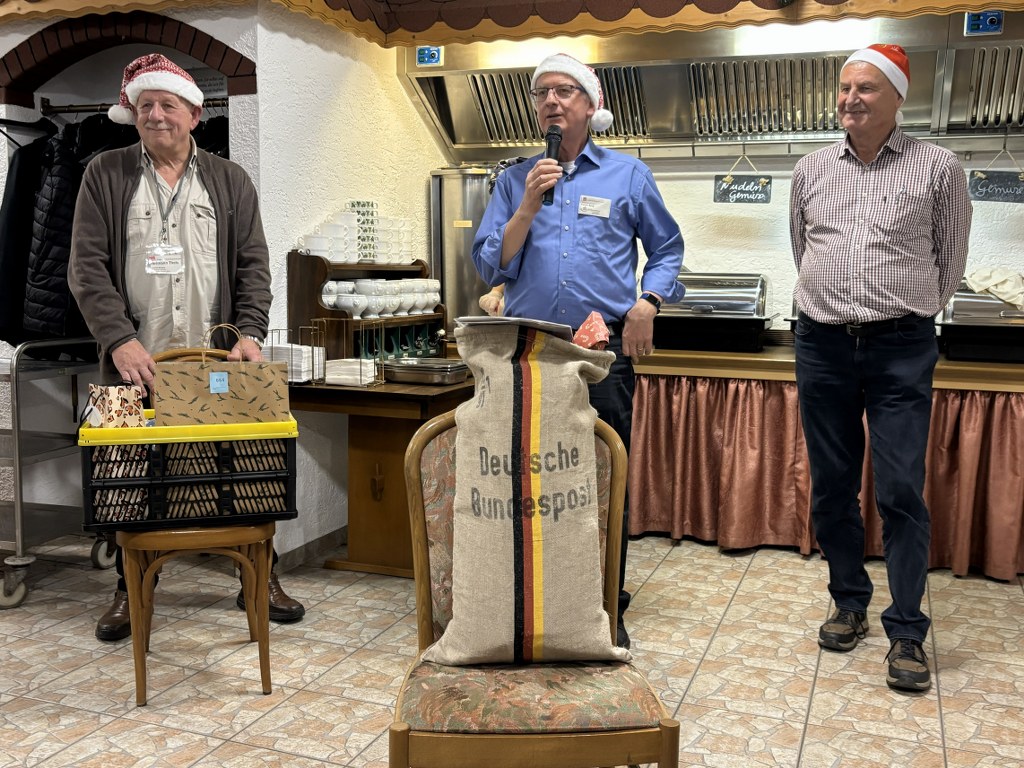 Vor dem reichlichen und leckeren Mittagessen vom Buffet hat jeder Teilnehmende eine Losnummer gezogen. Nach dem Mittagessen wurde es weihnachtlich. Mit Unterstützung unseres Kollegen Norbert Olk und seiner Gitarre sangen wir im Leinenhof althergebrachte, gemeinfreie Weihnachtslieder. Im Pappelhof übernahm dies unsere Kollegin Heike Baasch mit dem Akkordeon. Sie wurde von den Anwesenden mit verschiedenen Rhythmus-Instrumenten aktiv unterstützt. Der Mitmacheffekt hat die Stimmung gesteigert und allen sehr gut gefallen. Auch Weihnachtsgedichte und -geschichten wurden vorgetragen. Rainer Berg hat den Nikolaus vertreten und mit seinen drei Nikolaus-Helfern die Präsente aus dem Nikolaus-Postsack an die Seniorinnen und Senioren mit der entsprechenden Losnummer verteilt. Die Präsente wurden vom Betreuungswerk, dem SBR, der ver.di-BeG, der VPV, der PSD-Bank-West, der GUV-Fakulta sowie von Teilnehmerinnen und Teilnehmern gespendet.